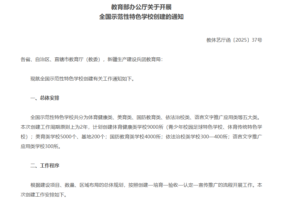 近日,教育部办公厅印发关于创建国家示范性特色学校的通知。会议指出,全国示范特色学校主要分为体育健康类、美育类、国防教育类、依法管理学校、语言文字推广应用类五个主要类别。创建工作周期原则上为2年,拟创建:9000所体育健康学校(青少年校园足球特色学校和传统体育学校); 5000所美育学校、200个基地; 4000所国防教育学校; 300-400所依法办学的学校; 300所学校推广应用。南方网广东考察记者 卢少聪