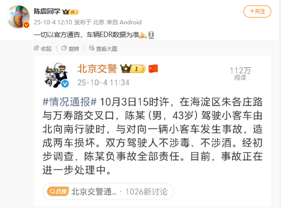 @Beijing交通警察于10月4日发出通知:10月3日左右,在10月3日左右,在Haidian District的Zhugezhuang Road和Wanshou Road的交汇处,Chen(Man,43岁)正从北部驾驶一辆乘用车,一辆事故发生在对面的客车中。双方的司机都不参与毒品或酒精。初步调查后,陈对事故完全负责。目前,事故更加处理。随后,汽车博主通过了 @官网网通知的屏幕截图,并说:“每个人都受到正式通知,EDR车辆的数据应占主导地位。”