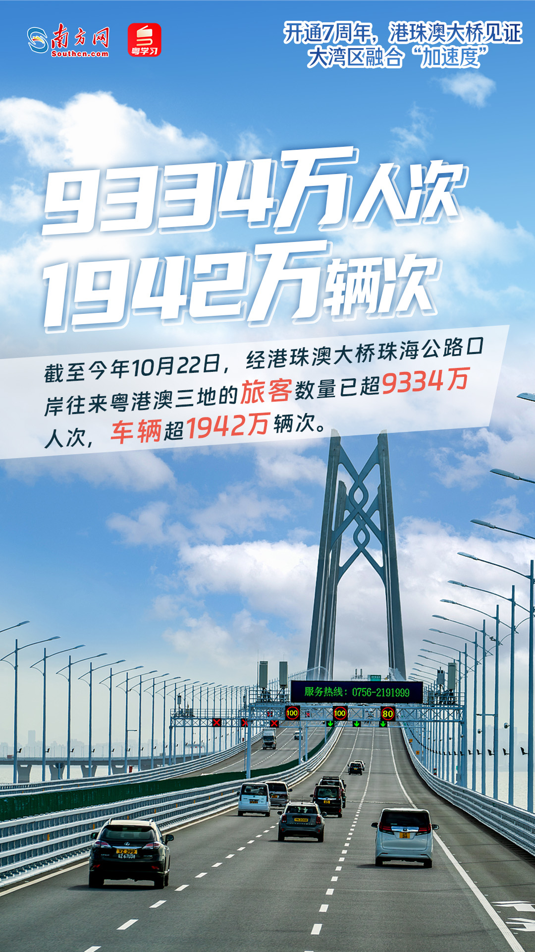 2018年10月23日,港珠澳大桥正式通车。自此,一桥跨越三区,大湾区联动发展加速。随着港珠澳大桥连接,粤港澳三地驾车距离显着缩短,居民出行更加便捷,物流运输成本显着降低:香港、珠海、澳门“1小时生活圈”已形成;通过港珠澳大桥珠海公路口岸往来粤港澳的旅客量已突破9334万人次。车辆保有量超过1942万辆;平均每天有超过160万个包裹通过港珠澳大桥出口,到达世界各地……七年来,港珠澳大桥不断刷新交通量和客流量新纪录。交通畅通、人流畅通、货物畅通成为常态,有效推动大湾区协调一致、高质量发展。策划:陈海民 设计:王婉莹