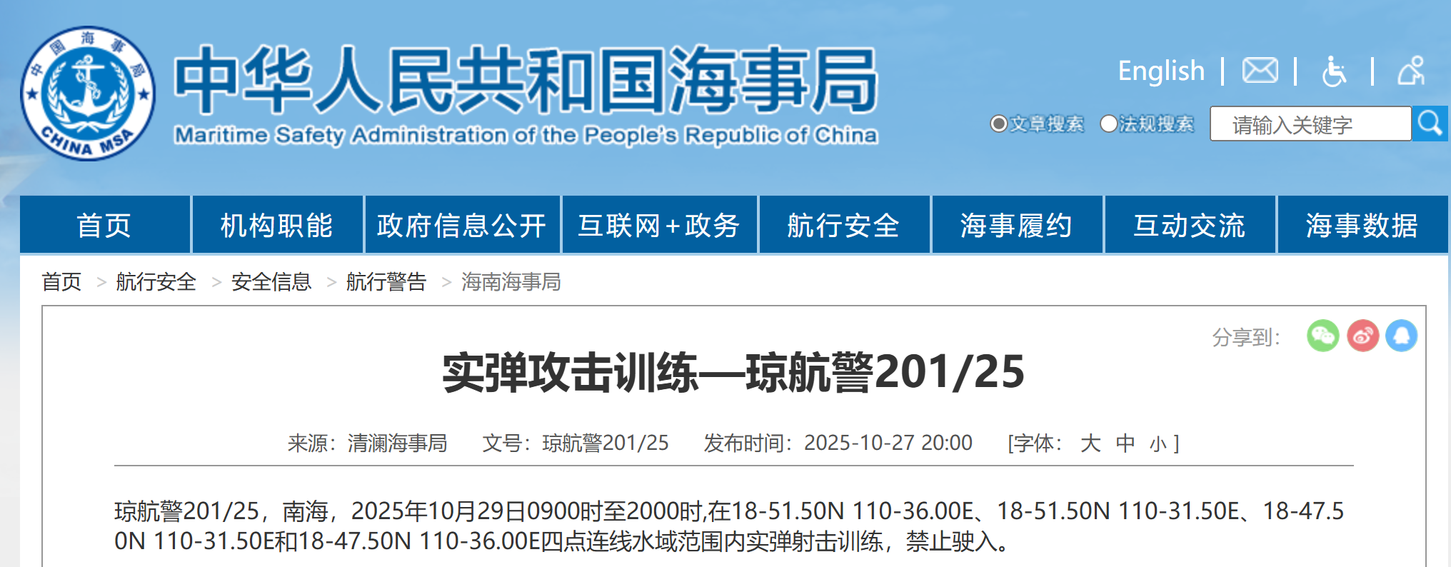 记者从中国海事局获悉,10月29日9:00至20:00将在南海部分海域进行实弹训练,提醒无关船舶不得入境。具体水域覆盖范围为:18-51.50N 110-36.00E、18-51.50N 110-31.50E、18-47.50N 110-31.50E和18-47.50N 110-36.00E四点连接。南方网广东考察记者朱文婷