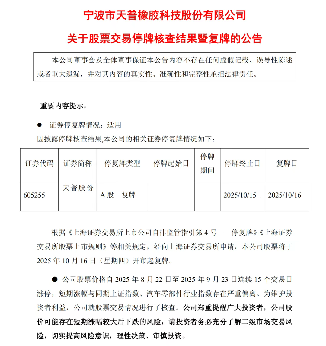 - 阅17510月15日,天普股份(605255.SH)发布公告称,公司股票将于2025年10月16日开市交易。......