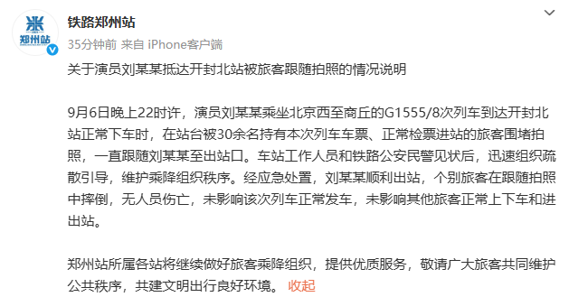 9月8日,@zhirail Zhengzhou发布了支票,以进入平台上的车站,然后在出口处的Liu Moumou。看到这一点后,车站和铁路警察的工作人员迅速组织了疏散和指导,以维持登机和着陆。紧急响应后,Liu Moumou成功离开了车站。一些乘客在拍照时摔倒了,没有发现人员伤亡。这不会影响正常的火车拆除,或者其他乘客继续进入并进入并退出车站。与郑州站相关的所有站点将继续维修乘客并提供优质的服务。请询问大多数乘客,以维持公共秩序并为文明旅程开发一个良好的环境。 9月7日,一段视频“ Kaifeng North Station,整个出口都在混乱中!”吸引人。一些网民透露,这是由一位男演员造成的,该男性演员正在Kaifeng North Station沿高速铁路大量的球迷涌向平台。记者搜查并发现该事件发生在9月6日。演员刘Xuancheng。