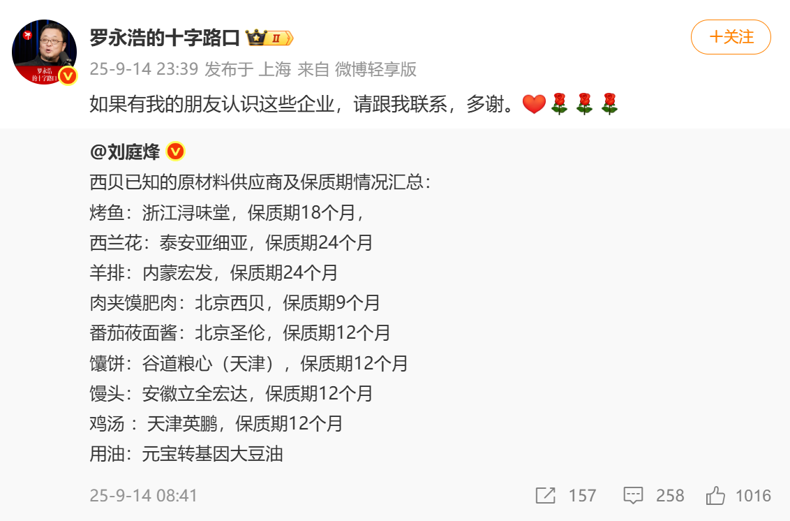 据红星资本局称,9月14日晚上,Xibei创始人Jia Guolong在一个特定行业团体中的屏幕截图被散布了。贾·物(Jia Guolong)说,她的回答是错误的。将来,Xibei将是透明的Xibei,并且该主题已成为热门搜索。但是一些网民立即宣布屏幕截图是一个不完整的版本,实际上,贾·圭隆(Jia Guolong)的陈述的后半部分。在Netizen提供的完整屏幕截图中,Jia Guolong称Luonyonghao为“网络黑帮”。这一事件吸引了隆东豪的注意。他通过他的微博帐户@luo Yonghao的十字路口传递了评论,并说“这东西无法表达”,然后表达了他希望与Raw Xibei供应商互动的希望。 @luo Yonghao的Cr Saidossroads了解“ Xibei可以完成的事情”。他希望与预制菜有关的国家法规很快就会发布,一次互联网的重点是第14天,以促进kitch-kitchen实时广播以保护消费者权利。但是,在媒体在14日当晚揭露了贾·物(Jia Guolong)声明的屏幕截图后,它再次引起了社交平台的广泛关注。随着网民暴露了媒体未暴露的屏幕截图的后半部分,情况将进一步增加。资料来源:广东学习记者朱的微博南部网络